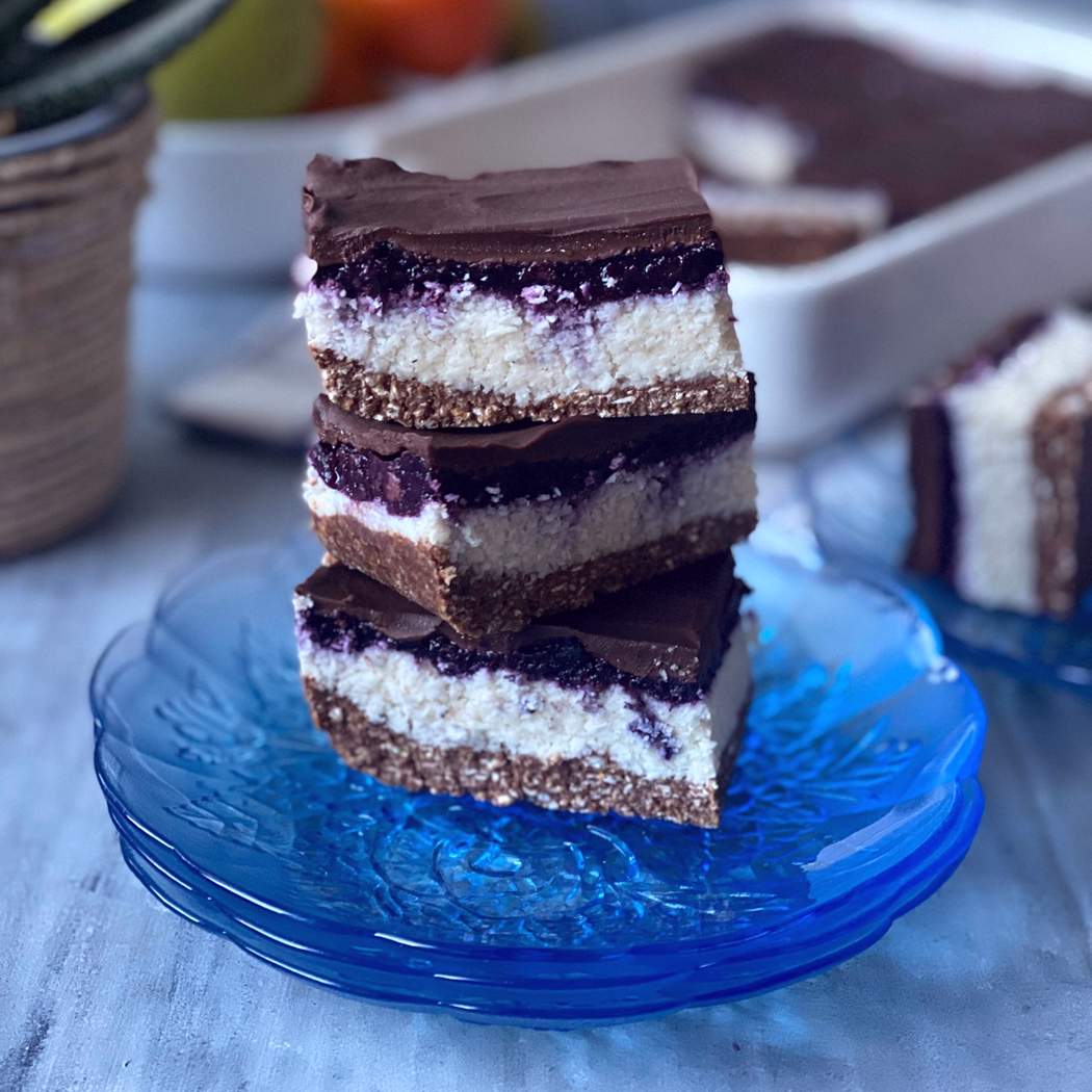 Barras de coco sin hornear con capa de arándano
