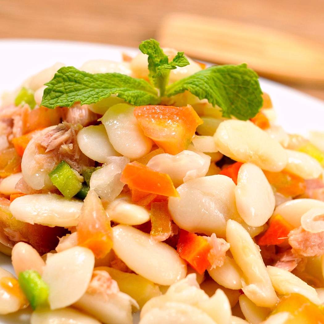 El 'empedrat' es una ensalada de verduras muy refrescante que está preparada con judías blancas, también se puede hacer con otros legumbres como garbanzos y lentejas.