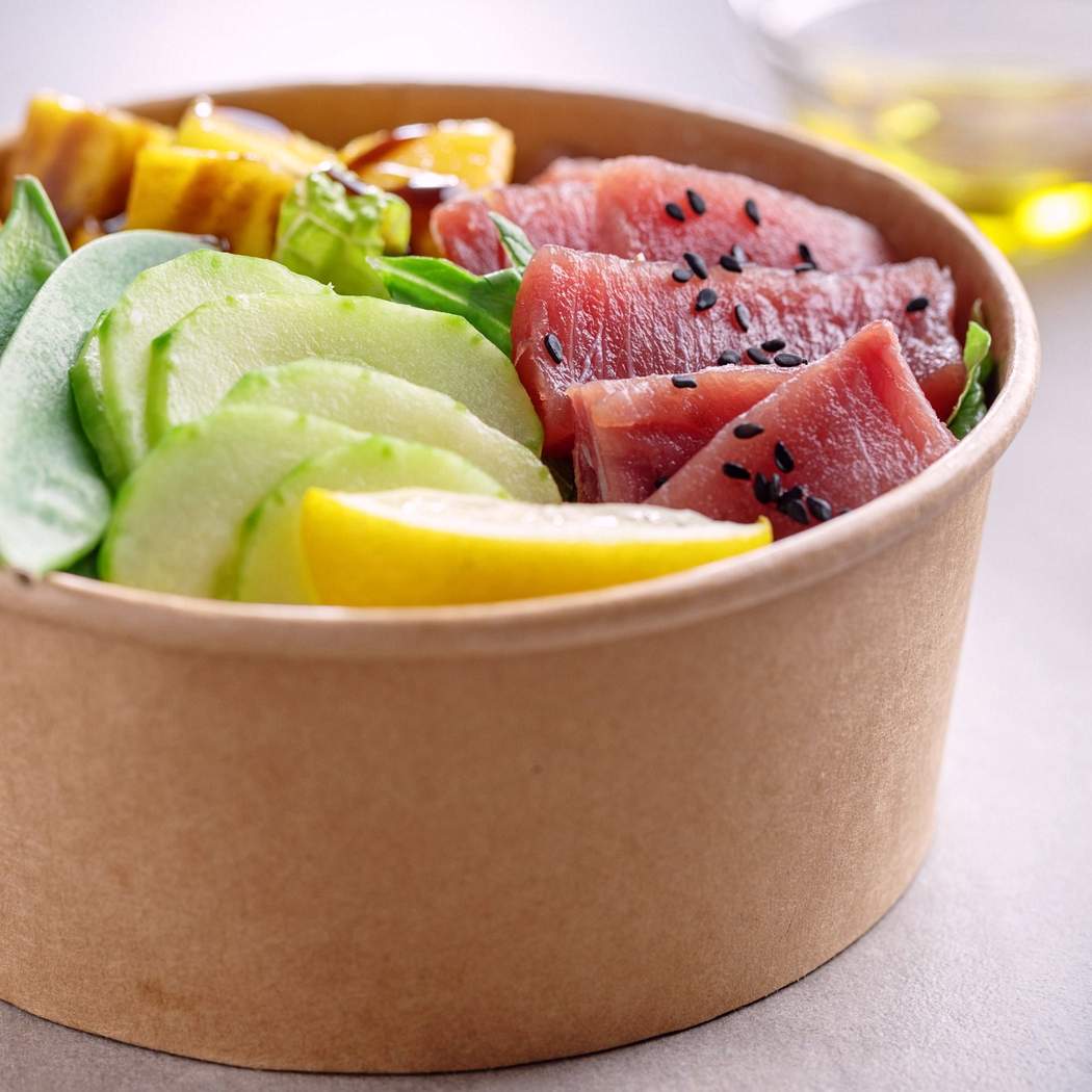 Primero, corta el atún en cubos, vierte salsa de soja, aceite, agrega el ajo y deja marinarlo todo en el refrigerador durante al menos 3 horas. Mientras tanto, prepara la quinoa según las instrucciones, corta el mango y las verduras.