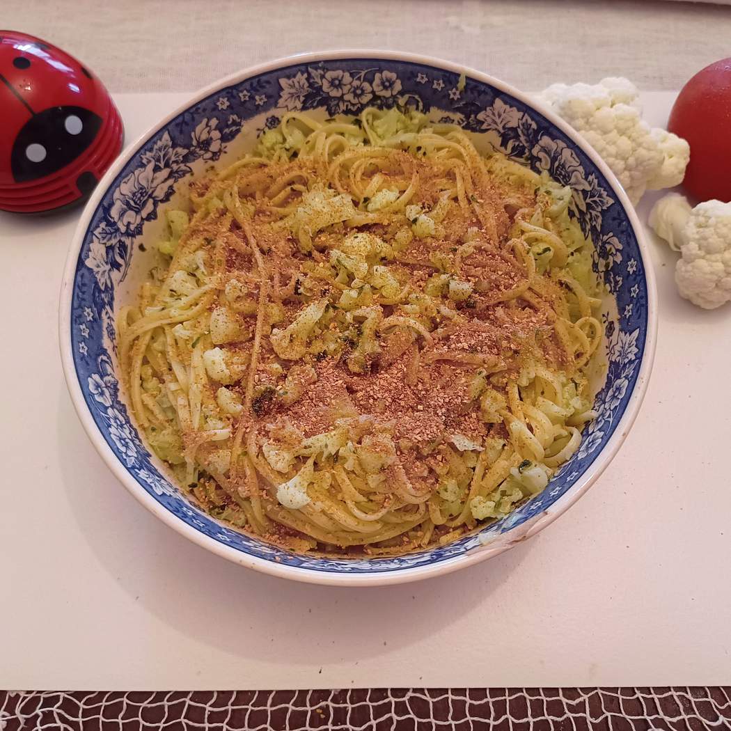 Spaghetti con coliflor saltado con ajo y perejil y agregado de pan rallado tostado